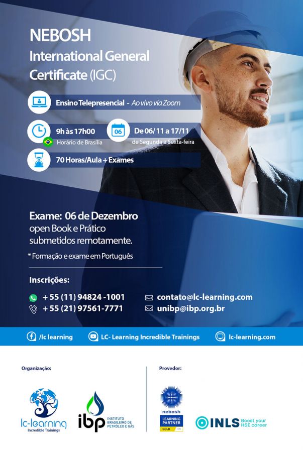NEBOSH: Comissão Nacional de Avaliação de Saúde e Segurança Ocupacional é um fornecedor líder, a nível mundial, de qualificações sobre saúde, segurança e ambiente. Site: https://www.nebosh.org.uk. A iNLS Solutions é uma empresa de formação e consultoria especializada nas áreas de ambiente, saúde e segurança. Site: http://inls-solutions.com. A UnIBP é a universidade do IBP (Instituto Brasileiro de Petróleo e Gás), criada para impulsionar o desenvolvimento da indústria no tempo do negócio. Site:https://www.unibp.com.br/ LC-LEARNING: A LC-Learning oferece cursos em SSMA mundialmente reconhecidos, no idioma local, onde quer que esteja. Atuando com parceiros renomados e referenciados pelo saber. Site: http://lc-learning.com